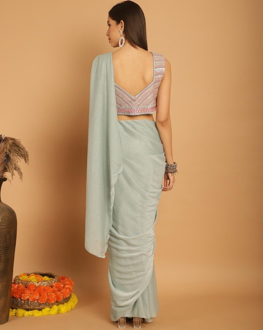 - The last image gives a detailed look of the blouse piece that comes with this saree (The model is wearing a blouse from our in-house wardrobe)