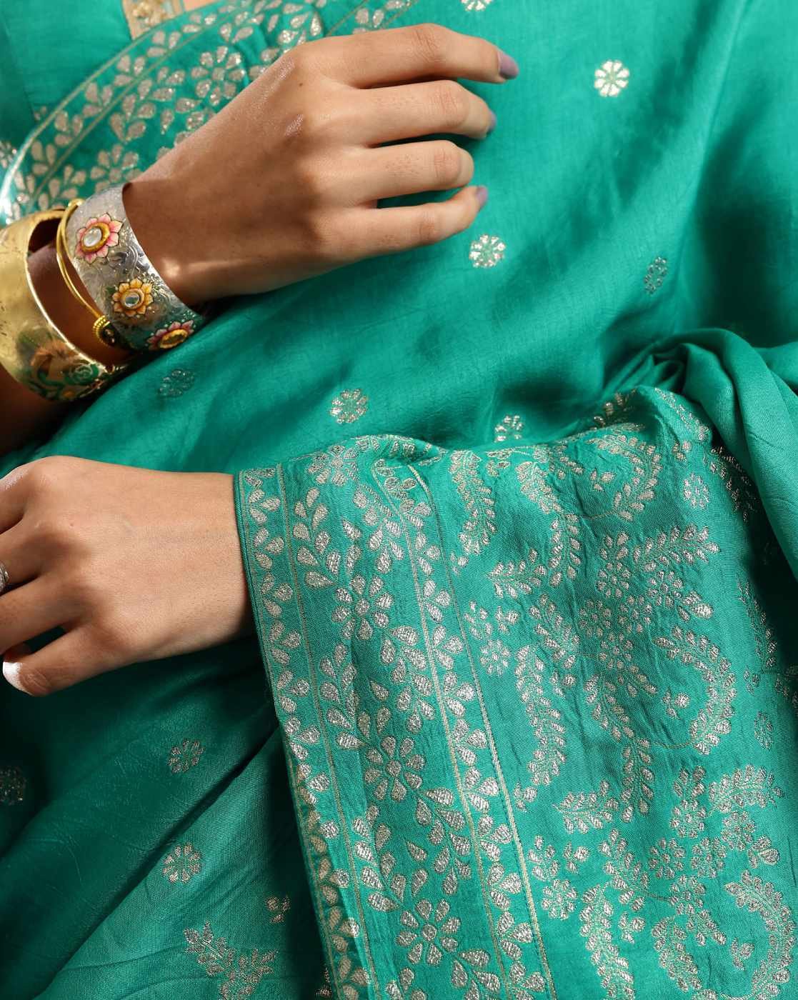- The last image gives a detailed look of the blouse piece that comes with this saree (The model is wearing a blouse from our in-house wardrobe)